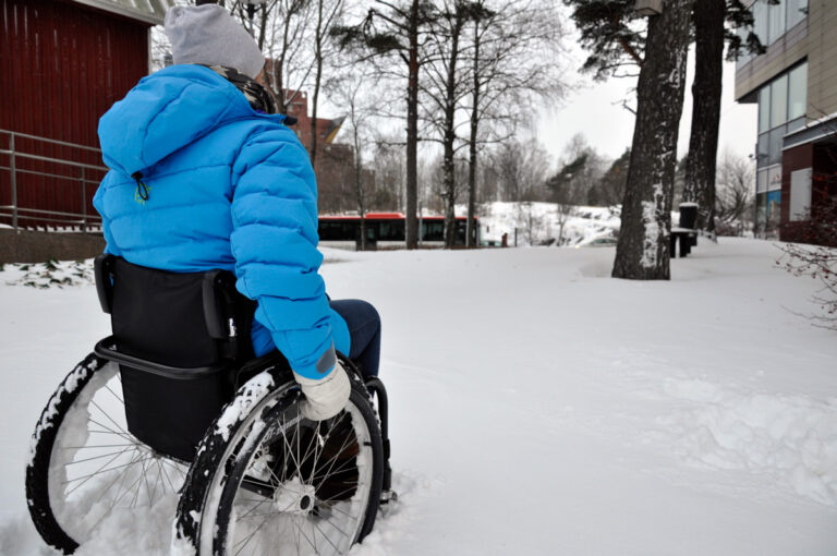 Matka piha-alueen poikki autolle voi tyssätä jo alkumetreille, kun pyörätuoli jää jumiin hankeen. Tai jos kelaus auton luokse onnistuu, voi auton putsaaminen lumesta aiheuttaa seuraavan haasteen.